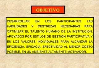El documento trata sobre el desarrollo del talento humano. Su objetivo es desarrollar habilidades y destrezas en los participantes para optimizar el talento humano de la institución mediante estilos de gestión participativos y los valores individuales, logrando la eficiencia, eficacia y efectividad al menor costo posible. Cubre temas como la gestión del talento humano, el ser humano, los elementos y procesos de la empresa, la administración de recursos humanos, la motivación y los refuerzos.