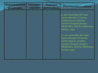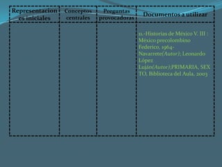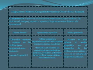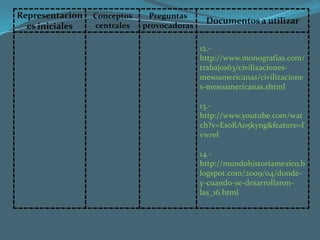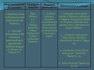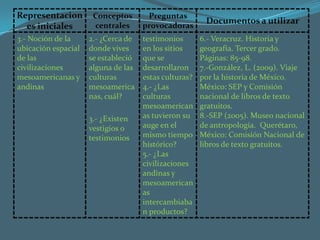 Este documento presenta una secuencia didáctica sobre las civilizaciones mesoamericanas y andinas. Los estudiantes completarán esquemas sobre las ubicaciones y culturas principales de estas civilizaciones. Luego investigarán más sobre estas a través de textos, visitas al museo y proyectos. Finalmente, los estudiantes prepararán seminarios en equipos sobre las diferentes civilizaciones, donde presentarán mapas conceptuales y glosarios con los conceptos aprendidos.