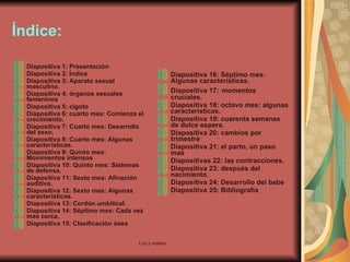 El documento describe las diferentes etapas del desarrollo fetal a lo largo de los nueve meses de embarazo, incluyendo cambios físicos, formación de órganos y sistemas, y hitos importantes en cada mes. Explica también los procesos del parto, incluyendo contracciones, dilatación y nacimiento del bebé, así como los cambios en la madre y el recién nacido después del parto.