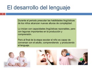 El documento describe el desarrollo del lenguaje en la etapa prescolar. Inicialmente, los niños tienen habilidades lingüísticas básicas pero limitadas, pero hacia el final de esta etapa pueden conversar fluidamente con adultos. El lenguaje florece rápidamente entre los 2 y 3 años cuando los niños empiezan a usar oraciones más largas, plurales, preguntas complejas y tiempos verbales como el pasado. El habla privada guía el pensamiento y comportamiento, mientras que el habla social se dirige a otros. La exposición al len