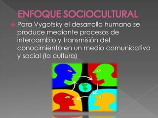 Este documento describe la teoría de Lev Semiónovich Vygotsky sobre la adquisición del lenguaje. Vygotsky argumenta que el desarrollo humano ocurre a través de procesos de intercambio social y cultural, y que el lenguaje es el principal vehículo para la transmisión de conocimiento cultural. El lenguaje y el pensamiento se desarrollan por separado inicialmente, pero eventualmente se entrelazan para formar el pensamiento verbal hacia los dos años de edad.