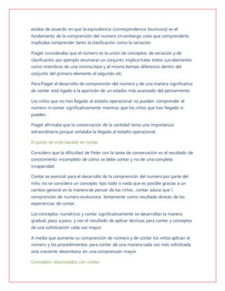 El documento discute diferentes perspectivas sobre el desarrollo del concepto numérico en los niños. Se mencionan las teorías de Piaget sobre la necesidad de comprender la clasificación y seriación para entender el número, así como la perspectiva de que la experiencia de contar es fundamental. Finalmente, se describe cómo a través de contar conjuntos pequeños los niños pueden descubrir principios como la equivalencia y desarrollar conceptos aritméticos básicos.