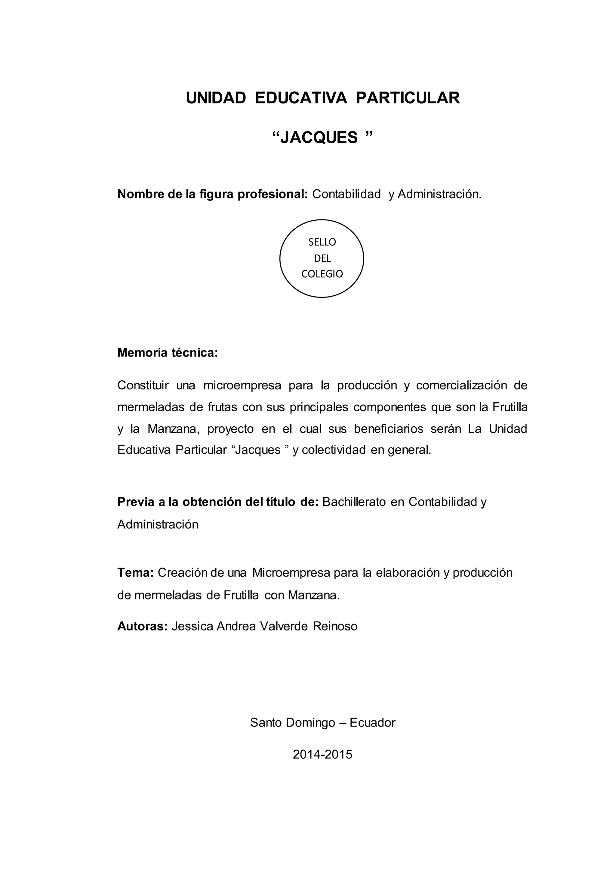 Este documento presenta un proyecto para crear una microempresa para la producción y venta de mermeladas de frutilla y manzana en la Unidad Educativa Particular “Jacques” con el objetivo de generar ingresos y empleos. El proyecto busca elaborar un producto nutritivo y de bajo costo utilizando frutas locales como la frutilla y la manzana sin aplicar químicos. De esta forma, se beneficiará a los estudiantes y a la comunidad local al combatir el desempleo.