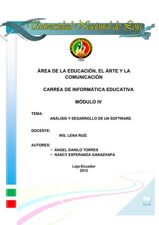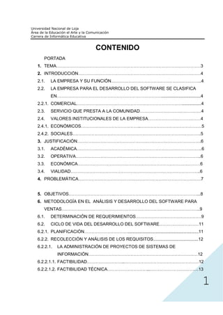 Este resumen describe el desarrollo de un sistema de ventas para una copiadora y papelería universitaria en Loja, Ecuador. Se realizará un análisis y desarrollo de software para llevar un mejor control de inventario, ventas, facturación y contabilidad. Se utilizará la metodología de determinación de requisitos, diseño de la base de datos, diagramas de casos de uso y secuencia, y prototipos. El software ayudará a la empresa a conocer su stock, ventas diarias/semanales, ganancias/pérdidas