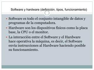 El documento describe brevemente el software, hardware, sistemas operativos y tipos de software. Explica que el software son los programas y datos de una computadora, mientras que el hardware son los dispositivos físicos. También describe los diferentes tipos de software como software de sistema, de programación y de aplicación.