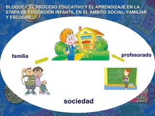 Este documento describe el proceso educativo y de aprendizaje en la etapa de educación infantil. Explica que el niño aprende como miembro de tres grupos sociales principales: la familia, la sociedad más amplia, y la escuela. Detalla cómo cada uno de estos grupos influye en el desarrollo del niño a través de la estimulación, las expectativas, los modelos educativos y de aprendizaje. También describe el papel del maestro de educación infantil en planificar, implementar y evaluar situaciones de enseñanza