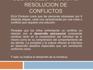 Este documento resume varios conceptos clave sobre el desarrollo psicosocial en la etapa preescolar según las teorías de Erickson. Los niños enfrentan conflictos entre la independencia y la culpa. Desarrollan su autoconcepto y sentido de identidad. Aprenden sobre género, raza y etnia a través de la cultura. Juegan para desarrollarse social y cognitivamente. Forman amistades basadas en la compañía. Su teoría de la mente les permite comprender los pensamientos de los demás.