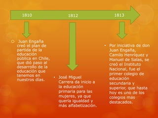 El documento resume el desarrollo de la educación en Chile entre 1810 y 1960. En este periodo se establecieron las bases del sistema educativo chileno a través de la creación de escuelas primarias, secundarias y universidades públicas. También se implementaron leyes que establecieron la educación primaria obligatoria y gratuita para todos los ciudadanos chilenos.
