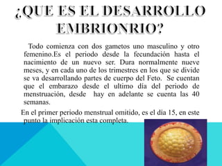 El documento resume las principales etapas del desarrollo embrionario y fetal durante las 40 semanas de embarazo, desde la fecundación hasta el nacimiento. Describe los cambios físicos que experimenta el feto semana a semana, incluyendo el crecimiento de órganos y la formación de extremidades. También menciona algunos síntomas físicos y emocionales que experimenta la madre durante cada trimestre.