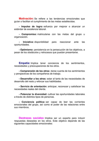 Este documento resume las 5 habilidades de la inteligencia emocional identificadas por Daniel Goleman y las competencias emocionales asociadas a cada una. La autoconciencia implica reconocer los propios estados de ánimo y recursos. La autorregulación se refiere a manejar los propios estados de ánimo e impulsos. La motivación guía el cumplimiento de metas. La empatía implica tener conciencia de los sentimientos de los demás. Las destrezas sociales implican inducir respuestas deseadas en otros.