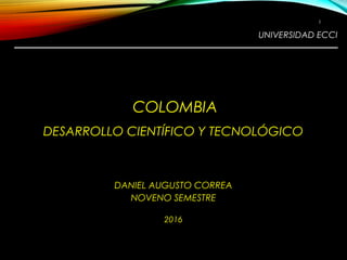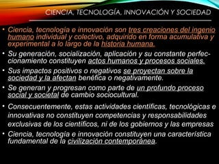 El documento describe la relación entre ciencia, tecnología, innovación y sociedad. Explica que estos son procesos sociales que se generan de forma acumulativa a lo largo de la historia y tienen impactos tanto positivos como negativos en la sociedad. También analiza factores como la nueva ciencia multidisciplinaria, la tercera revolución industrial, la globalización y la brecha científica y tecnológica de Colombia. Finalmente, resalta que el desarrollo científico y tecnológico requiere de
