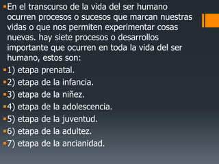 El documento describe las siete etapas del desarrollo humano: prenatal, infancia, niñez, adolescencia, juventud, adultez y ancianidad. Cada etapa se caracteriza por cambios físicos, psicológicos y cognitivos específicos que marcan la evolución de una persona a lo largo de su vida.
