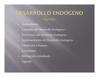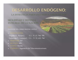 Este documento presenta la estrategia de desarrollo endógeno para Venezuela. El desarrollo endógeno significa que las comunidades desarrollan sus propias soluciones desde adentro en lugar de depender de factores externos. El documento discute la implementación del desarrollo endógeno, los obstáculos a superar como la desinformación y el egoísmo, y concluye que este enfoque puede satisfacer las necesidades básicas de los ciudadanos y promover un desarrollo positivo del país.