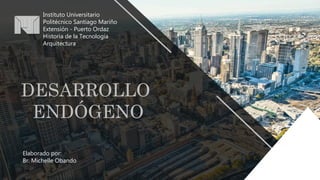 El documento describe el desarrollo endógeno, un modelo que busca potenciar las capacidades internas de una región para fortalecer su sociedad y economía de manera sostenible a largo plazo. Se basa en las necesidades de la comunidad y coordina acciones políticas, económicas, sociales, ambientales y culturales para satisfacerlas. Tiene sus orígenes en el sur de España en los años 1960-1970 y ha sido promovido por el gobierno de Venezuela desde 2000.