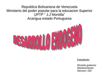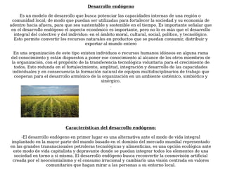 El documento describe el desarrollo endógeno, un modelo que busca potenciar las capacidades internas de una región para fortalecer su sociedad y economía de manera sostenible. Se enfoca en desarrollar integralmente a las personas en lo moral, cultural, social, político y tecnológico. Fomenta el intercambio de conocimientos entre los miembros de una organización para su crecimiento conjunto. Presenta ventajas como la solidaridad y cooperación comunitaria, pero también desventajas como la falta de preparación ciudadana para este modelo.
