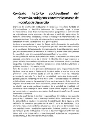 El documento describe el nuevo modelo de desarrollo endógeno propuesto por el presidente Hugo Chávez para reemplazar el modelo capitalista. El desarrollo endógeno se basa en satisfacer las necesidades de la población y promover el desarrollo integral e individual a través de la participación popular, el cooperativismo y el aprovechamiento sostenible de los recursos locales.