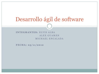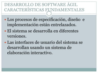 Este documento presenta información sobre el desarrollo ágil de software. Describe características como la entrelazada especificación, diseño e implementación y el desarrollo del sistema en diferentes versiones. También cubre métodos ágiles como Scrum, Crystal y desarrollo dirigido por características, así como principios como la participación del cliente, entrega incremental y adopción del cambio. Finalmente, discute escalamiento de métodos ágiles a sistemas grandes.