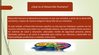 El desarrollo humano es un proceso integral que mejora las condiciones sociales, económicas y de salud de los individuos. Varias teorías, como las de Freud, Erikson, Piaget y Vygotsky, exploran diferentes aspectos del desarrollo humano, desde el crecimiento psicológico hasta la adquisición de capacidades cognitivas y morales. La superación personal y el autoconocimiento son fundamentales para alcanzar el potencial humano y desarrollar virtudes como la honestidad, la responsabilidad y la empatía.