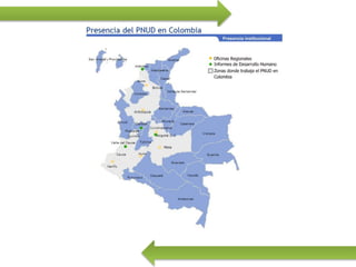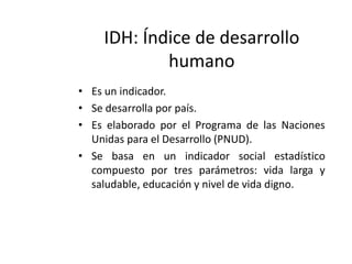 El documento habla sobre el Índice de Desarrollo Humano (IDH) que mide tres parámetros clave del desarrollo humano: esperanza de vida saludable, educación y nivel de vida digno. El Programa de las Naciones Unidas para el Desarrollo (PNUD) elabora el IDH por país y promueve el desarrollo sostenible que satisfaga las necesidades de las generaciones actuales sin comprometer las de las futuras. El PNUD trabaja en 177 países para conectarlos con los recursos necesarios para mejorar las vidas de