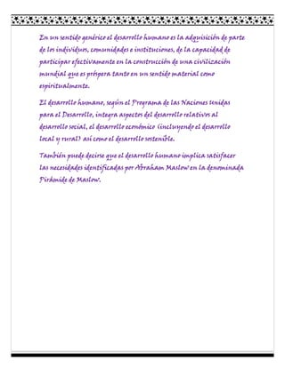 El desarrollo humano se refiere al proceso por el cual una sociedad mejora las condiciones de vida de sus ciudadanos a través de satisfacer sus necesidades básicas y complementarias, y crear un entorno que respeta los derechos humanos. El desarrollo humano considera aspectos como la calidad de vida, el bienestar individual y social, y la felicidad, e integra aspectos del desarrollo social, económico y sostenible.
