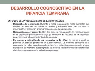 El documento describe el desarrollo cognitivo a lo largo de las diferentes etapas de la vida, incluyendo la infancia temprana, la infancia media, la adolescencia, la adultez emergente y la adultez tardía. Durante la infancia temprana, los niños mejoran su memoria y procesamiento de la información. En la infancia media, los niños desarrollan habilidades como el razonamiento lógico. En la adolescencia, los jóvenes mejoran su memoria de trabajo y procesamiento de la información. En la adultez,