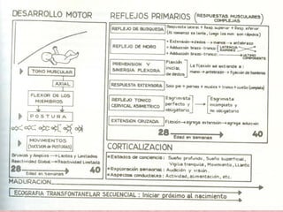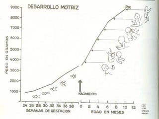 El documento trata sobre el desarrollo infantil. Explica que el desarrollo requiere la maduración normal del sistema nervioso central y factores ambientales. Se describen las áreas del desarrollo como el control postural, coordinación visomotora, lenguaje y socialización. También habla sobre las etapas del desarrollo del lenguaje y tipos de retrasos.