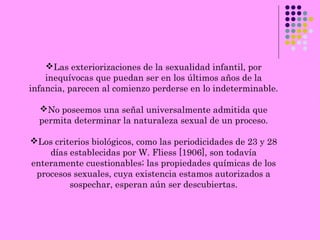El documento resume las principales etapas del desarrollo libidinal y las organizaciones sexuales en la infancia. Explica que la sexualidad infantil pasa por fases pregenitales donde priman las pulsiones orales, sádicas y anales antes del primado genital en la pubertad. También describe el complejo de Edipo y el vínculo libidinoso del niño con sus padres, especialmente la madre, como primer objeto de amor. Finalmente, señala que el desarrollo normal requiere desprenderse de los padres al entrar en