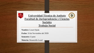 El documento describe el desarrollo local como un proceso de transformación económica y social orientado a mejorar las condiciones de vida de la población local a través del aprovechamiento de los recursos endógenos. Define tres dimensiones del desarrollo local: económica, socio-cultural y político-administrativa. También identifica a los empresarios, trabajadores, sociedad civil organizada y estado como los principales agentes del desarrollo local.