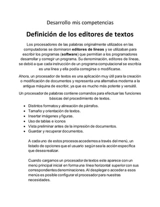 Este documento define los editores de texto y procesadores de palabras, explicando que son aplicaciones útiles para crear y modificar documentos de manera más potente y versátil que una máquina de escribir. Luego enumera las ventajas de los procesadores de texto para los estudiantes, incluyendo su capacidad de editar documentos fácilmente, cambiar formatos, incorporar imágenes, y revisar ortografía.