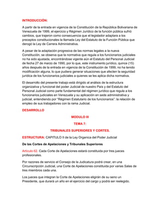 Este documento describe la estructura del poder judicial venezolano. Explica que las cortes de apelaciones y los tribunales superiores son los tribunales superiores, y describe sus funciones y composición. También explica los requisitos para ser juez, secretario y otro personal judicial, así como algunas de sus atribuciones.