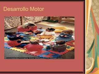 El documento describe el desarrollo de los sentidos, motricidad, personalidad y cognición en los primeros años de vida. Se explica que la audición, tacto y gusto están bien desarrollados al nacer, mientras que la visión y el olfato continúan perfeccionándose en los primeros meses. El control motor aumenta con hitos como gatear, sentarse y caminar entre los 5-15 meses. En cuanto a la personalidad, la confianza básica vs. desconfianza y la autonomía son clave en el segundo y tercer año. Finalmente,