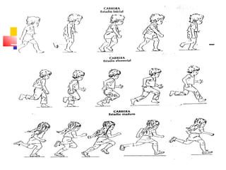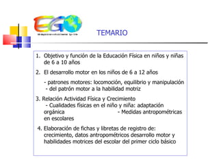 El documento describe las etapas del desarrollo motor en niños de 6 a 12 años. Explica que en esta edad los niños desarrollan patrones motores básicos como caminar, saltar y lanzar, y adquieren habilidades motoras específicas. También analiza la relación entre la actividad física y el crecimiento físico en los niños, señalando que si bien la actividad física favorece el desarrollo, el exceso puede causar problemas. Finalmente, presenta tablas sobre el crecimiento y aspectos b