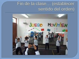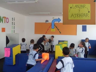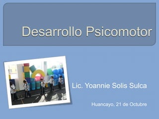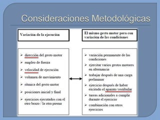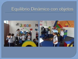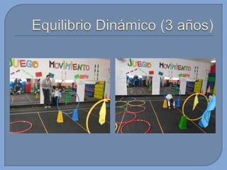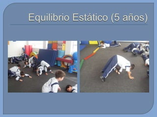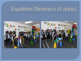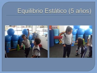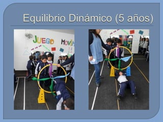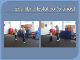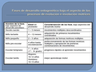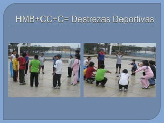 Este documento presenta información sobre el desarrollo motor en niños. Brevemente describe que en esta edad los niños tienen proporciones armoniosas del cuerpo que permiten un rápido mejoramiento de sus capacidades. También menciona algunas habilidades motoras básicas que desarrollan como gatear, caminar, saltar, patear, lanzar y atrapar. Finalmente, introduce conceptos sobre capacidades coordinativas como reacción, equilibrio y ritmo.