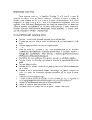 El documento describe las etapas del desarrollo psicomotor desde el nacimiento hasta los 6 años. Estas incluyen el control de la cabeza y las manos, la locomoción, y hitos cognitivos como el lenguaje y la resolución de problemas. El desarrollo motor y cognitivo progresa de reflejos innatos a mayor coordinación, independencia y pensamiento abstracto a medida que el niño crece.