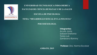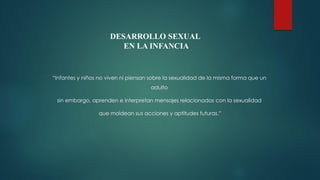 El documento describe las etapas del desarrollo psicosexual según Freud, incluyendo la etapa oral, anal, fálica, de latencia y genital. También describe las características de la sexualidad infantil, como la exploración del cuerpo y la búsqueda de placer, así como las etapas típicas del desarrollo sexual en la niñez entre los 0 y 12 años. Finalmente, señala que la sexualidad infantil busca el contacto físico y la satisfacción de la curiosidad de una manera egocéntrica y autoer