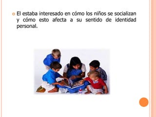 Erik Erikson propuso una teoría del desarrollo psicosocial que describe 8 etapas desde el nacimiento hasta la vejez. Cada etapa presenta un conflicto psicológico fundamental entre dos polos opuestos que debe resolverse para alcanzar una identidad personal sana. La teoría sostiene que la resolución exitosa de cada etapa influye en el desarrollo de la personalidad y las interacciones sociales a lo largo de la vida.