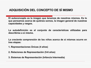 El desarrollo del autoconcepto en la infancia temprana (3-6 años) ocurre en tres etapas: representaciones únicas a los 4 años, relaciones de representación entre 5-6 años, y sistemas de representación en la infancia intermedia. Las emociones dirigidas al yo como la vergüenza y el orgullo se desarrollan a los 3 años. El juego contribuye al desarrollo ayudando a los niños a ensayar roles y comprender otras perspectivas.