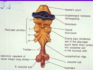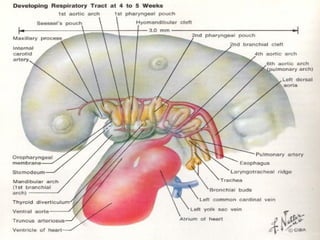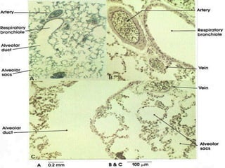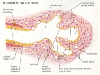 El documento describe las etapas del desarrollo pulmonar prenatal y postnatal. Prenatalmente, el pulmón pasa por las etapas embrionaria, pseudoglandular, canalicular y sacular entre la 5a y 40a semana de gestación, donde se forman los bronquios, vasos sanguíneos y alvéolos. Postnatalmente, entre los 1 y 8 años se produce la formación y maduración de los alvéolos, llegando a 300 millones para esa edad. El desarrollo vascular ocurre de forma paralela a la vía aérea