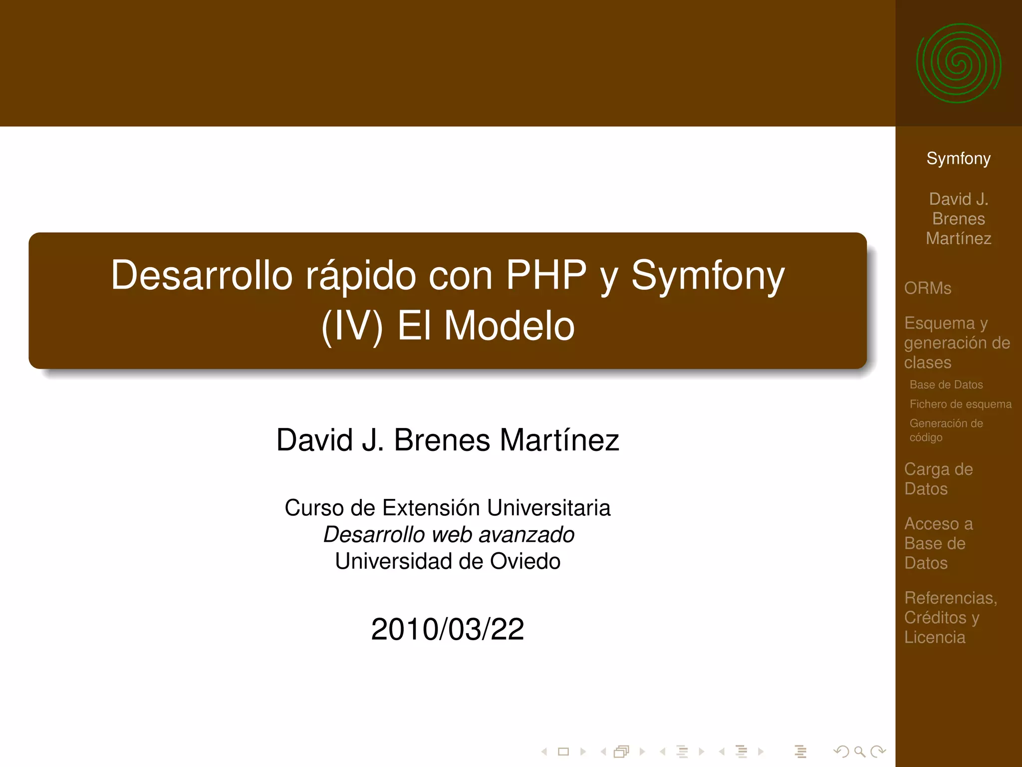 Este documento describe el uso de ORMs (Mapeadores de Objetos Relacionales) en Symfony. Explica cómo Symfony usa ficheros YAML para configurar las bases de datos y automatizar tareas como la generación de código y el acceso a datos, permitiendo trabajar con objetos en lugar de directamente con tablas y consultas SQL.