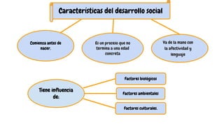 El documento describe el desarrollo social desde el nacimiento hasta los 3 años, incluyendo la adquisición de conductas sociales, la influencia de factores como la familia y la escuela, y los procesos de socialización y desarrollo de normas sociales. Explica que el desarrollo social comienza antes del nacimiento y continúa a lo largo de la vida a través de la interacción con agentes como la familia, la escuela y los grupos de iguales.