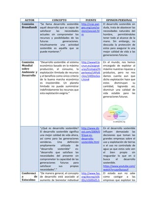 El documento presenta información sobre el concepto de desarrollo sostenible según diferentes fuentes. Se define desarrollo sostenible como aquel que satisface las necesidades del presente sin comprometer la capacidad de las generaciones futuras para satisfacer sus propias necesidades. Se señala que un planeta limitado no puede suministrar indefinidamente los recursos requeridos por un sistema económico basado en la máxima producción y consumo ilimitado, y que las decisiones de las grandes empresas a menudo no consideran el impacto a largo plazo en