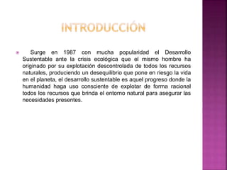 El documento trata sobre el desarrollo sustentable como alternativa para la conservación de los ecosistemas. Surge en 1987 ante la crisis ecológica causada por la explotación descontrolada de recursos naturales. El desarrollo sustentable busca un progreso económico que no destruya el medio ambiente y asegure las necesidades presentes y futuras mediante el uso racional de los recursos. La conservación de ecosistemas y la biodiversidad es fundamental para la sostenibilidad del planeta.