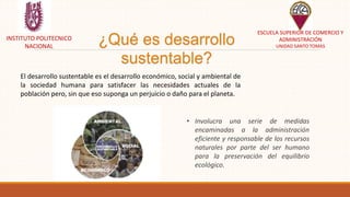 Este documento presenta información sobre el desarrollo sustentable en México. Explica que a pesar de que la constitución mexicana mencionaba la importancia de administrar los recursos naturales de manera equitativa y cuidadosa, no fue hasta 1988 que se creó la Ley General del Equilibrio Ecológico y 1994 que se formó la Secretaría de Medio Ambiente y Recursos Naturales. También describe brevemente los desafíos de México para lograr un crecimiento económico justo que proteja el medio ambiente y los recursos para las gener