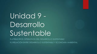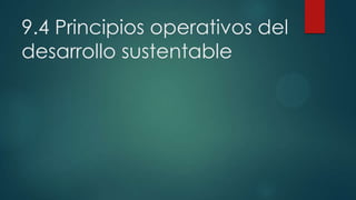 El documento describe los principios operativos del desarrollo sustentable como la irreversibilidad cero, la recolección sostenible y la selección sostenible de tecnologías. También examina la relación entre el desarrollo sustentable y la economía ambiental, argumentando que el crecimiento económico debe incorporar los costos ambientales y que soluciones conjuntas son necesarias. Finalmente, presenta indicadores de desarrollo sustentable en México y rankings internacionales.