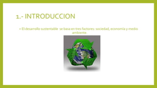 El documento habla sobre el desarrollo sustentable y cómo se basa en tres factores: la sociedad, la economía y el medio ambiente. Explica los conceptos de sustentabilidad y sus principios, así como las tres dimensiones de la sustentabilidad: la económica, la social y la ambiental. Finalmente, destaca la importancia de una visión sistémica que busque el equilibrio entre la empresa y el medio ambiente sin que uno afecte negativamente al otro.