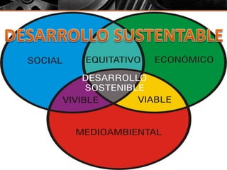 El documento define el desarrollo sostenible como el desarrollo económico, social y ambiental que permite satisfacer las necesidades del presente sin comprometer las capacidades de las futuras generaciones. Explica que el desarrollo sostenible incluye tres dimensiones: ecológica, económica y social. También describe los principios de una sociedad con desarrollo sostenible, como no reducir los recursos, no dañar los sistemas naturales y no reducir la estabilidad social. Finalmente, señala problemas ambientales como el cambio clim