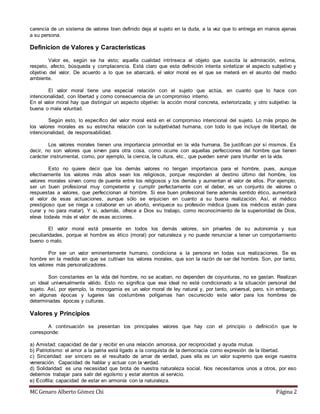 Este documento trata sobre la ética ambiental y los valores. Explica que los valores guían nuestro comportamiento y nos permiten juzgar nuestras acciones y las de los demás. También transmite la cultura y la sociedad. Los medios de comunicación tienen una gran influencia en la adquisición de valores, especialmente durante la adolescencia. Finalmente, discute varios valores como la amistad, el patriotismo y la solidaridad, y la importancia de la educación en valores.