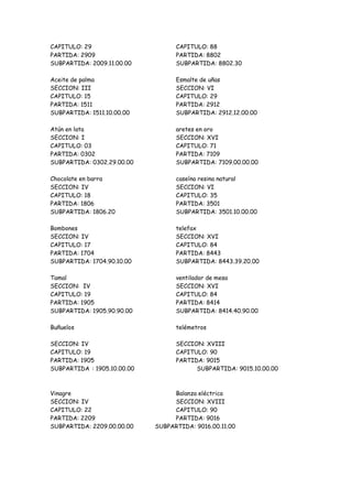 1) El documento lista diferentes productos agrupados por sección, capítulo, partida y subpartida de acuerdo a su clasificación arancelaria. 2) Incluye bienes como ladrillos, guantes, sillas, lámparas, concentrado para perros, cigarrillos, carbón y más. 3) Cada producto especifica su sección, capítulo, partida y subpartida para identificarlo de manera única dentro del sistema arancelario.