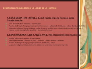 El documento describe el desarrollo tecnológico a lo largo de la historia, dividiéndolo en 8 etapas principales. En las primeras etapas, la humanidad dependía del fuego y la energía animal, y logró fabricar herramientas de piedra y madera. Más tarde, se domesticaron animales y cultivos, y surgieron las primeras civilizaciones con máquinas simples. La revolución industrial trajo la máquina de vapor y el carbón, y la segunda revolución industrial utilizó la electricidad y el petróleo para la produ