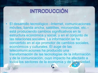 El documento discute el impacto de las nuevas tecnologías como Internet en la sociedad y las empresas. Explica que las tecnologías de la información como los equipos informáticos y las telecomunicaciones están transformando la economía y la sociedad al convertir la información en el eje central. También describe cómo Internet se ha vuelto esencial para las empresas de todos los tamaños y cómo ha cuestionado conceptos tradicionales sobre el tamaño de las empresas.